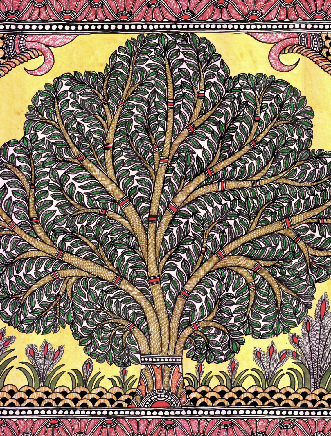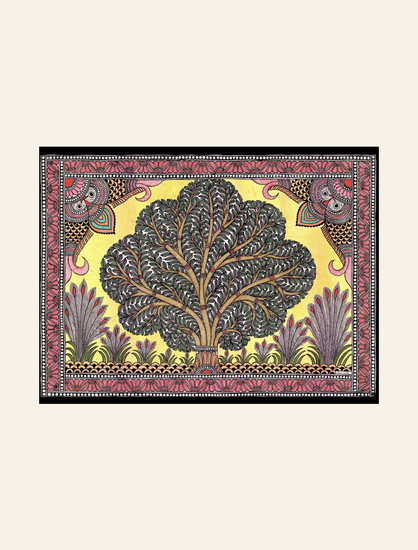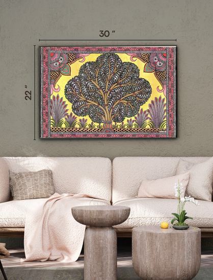 Elevate your interiors with this handcrafted Madhubani painting, celebrating India’s rich artistic heritage. Created in Bihar using organic paints, it features a grand Tree of Life with lush foliage, framed by delicate peacock motifs and traditional borders. It symbolizes growth, prosperity and connection. This piece merges authentic craftsmanship with contemporary decor sensibilities perfect for living rooms, bedrooms or as a thoughtful gift.