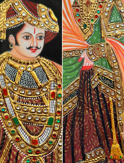 Bring royal elegance to your walls with this hand-painted Meenakari pair, featuring a majestic king and queen in traditional attire. Crafted on paper using organic paints, squirrel-hair brushes, and artificial gold accents, each detail from the crowns to the garments reflects centuries of Persian-inspired Indian craftsmanship. This exquisite pair adds opulence to home, office, hotel interiors.