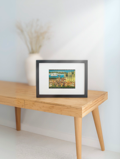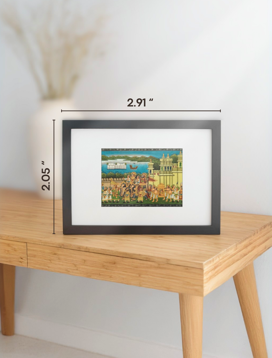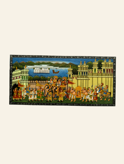 Celebrate the grandeur of Rajasthan with this stunning painting of a royal procession. Crafted by skilled Indian artisans using organic paints, squirrel-hair brushes, and touches of gold, it captures every detail from the majestic elephants to the royal escort and fort backdrop. Rich colors and careful brushwork depict centuries of Rajasthani and Persian artistic traditions. This piece is perfect for elevating contemporary or classic interiors.