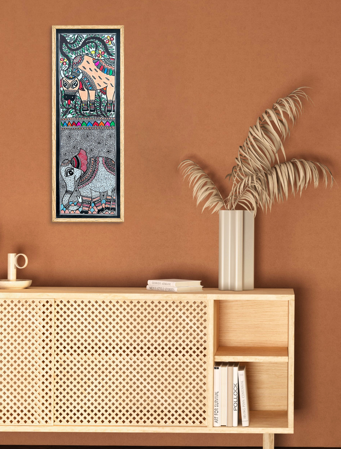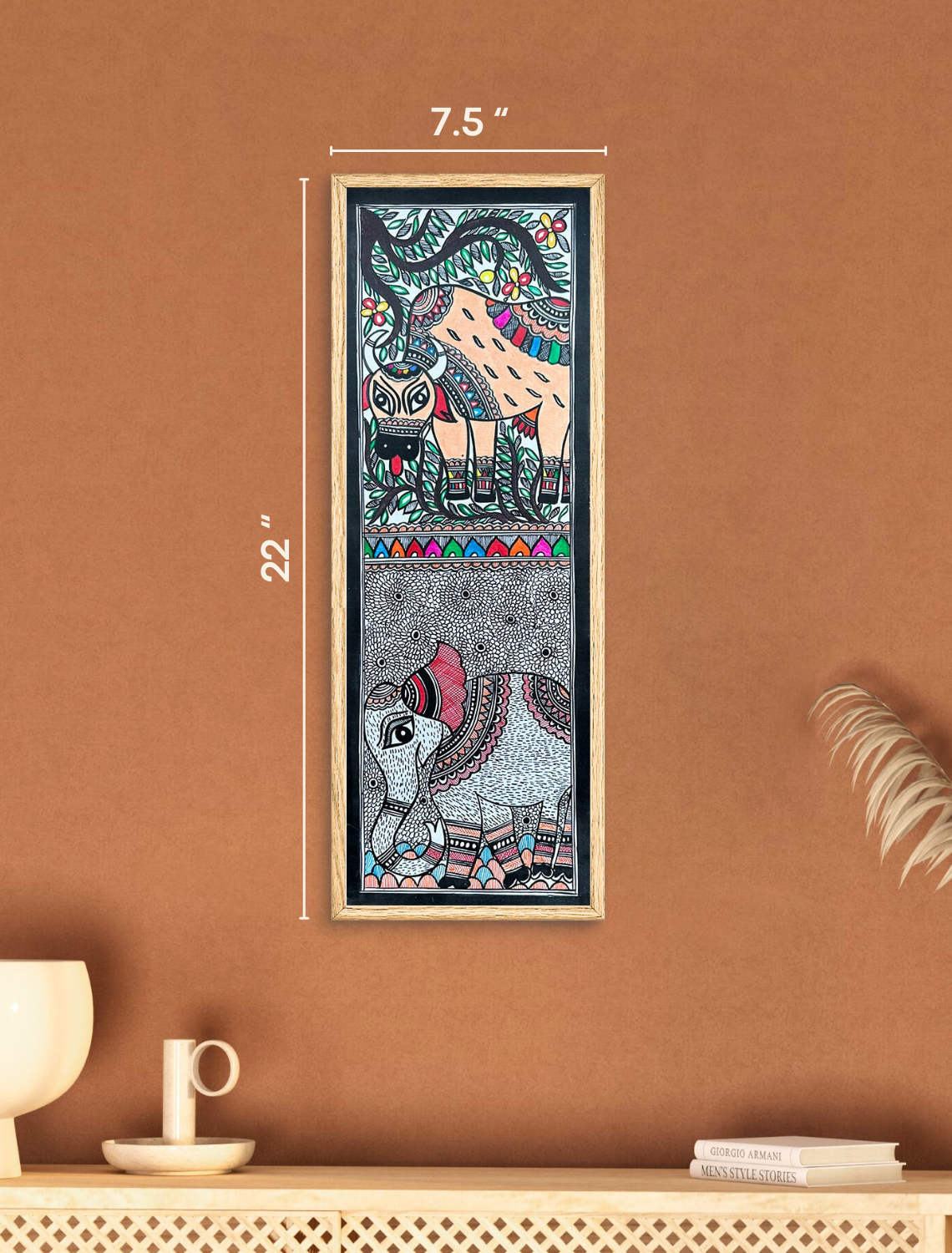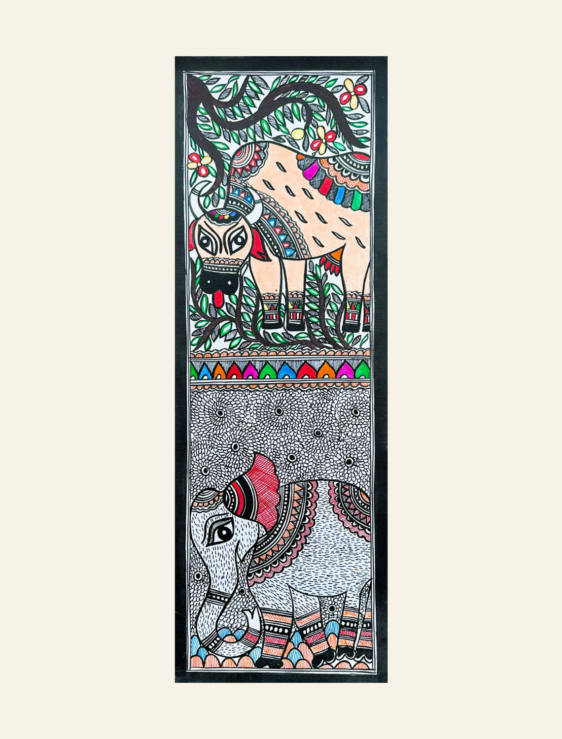 Experience the harmony of nature and tradition with this hand-painted Madhubani piece. Featuring a proud elephant and a serene grazing cow, it symbolizes tranquility. Crafted using organic pigments and time-tested methods such as finger painting, nib-pens, and twigs, this piece reflects the mastery of Mithila’s women artisans. Hang it in any room to infuse the space with cultural richness and refined elegance.