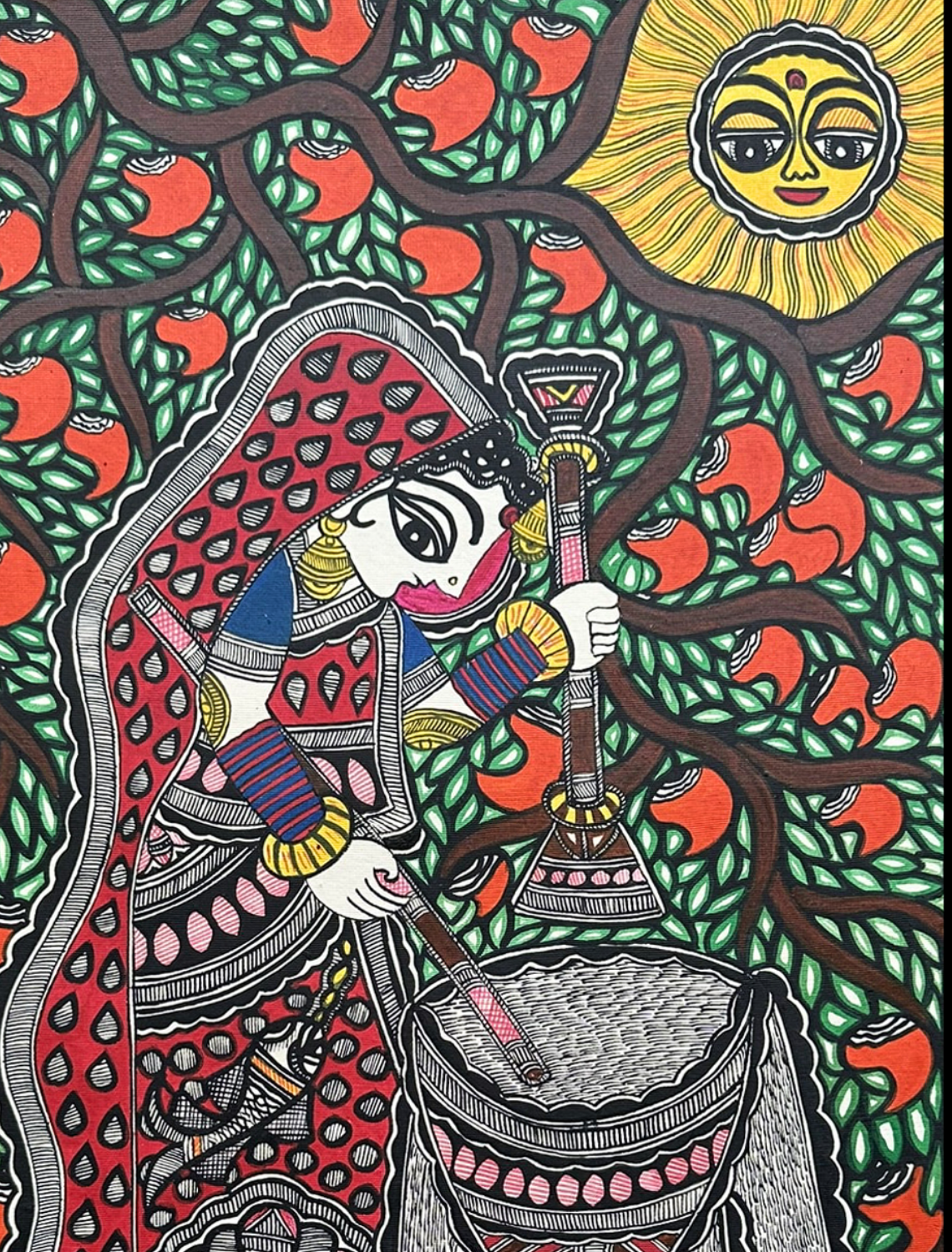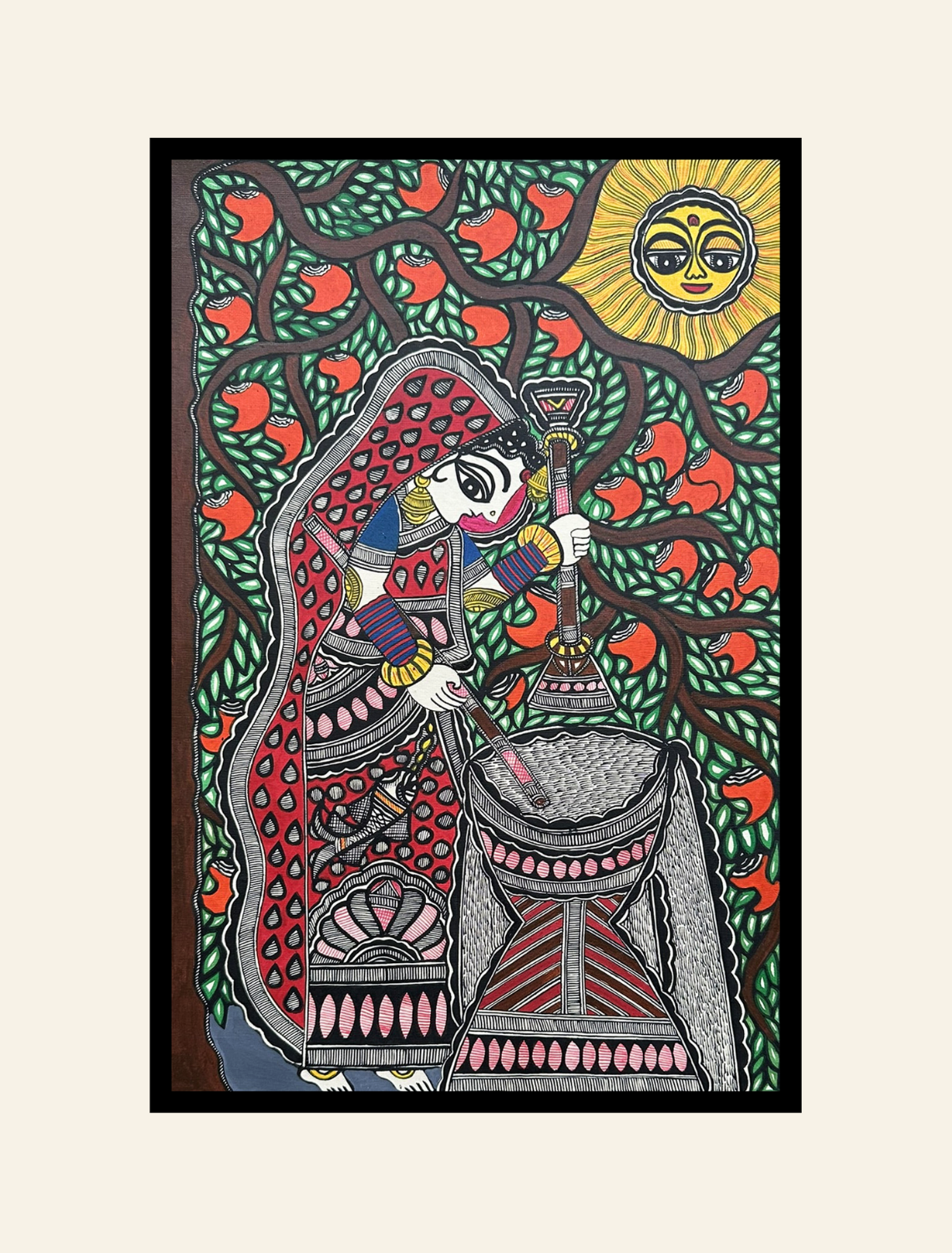 This original Madhubani painting captures the rhythm of village life, where women work gracefully beneath the midday sun. Crafted with natural pigments and organic oils on textured paper, the piece carries the signature intricacy of Mithila artistry. Rooted in generations of storytelling, it blends cultural depth with modern appeal. A striking statement against both bright and neutral walls, this artwork adds character to contemporary interiors.